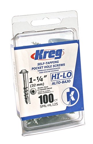 Features:Maxi-Loc washer headAll purpose, works in a variety of wood species#2 square drive recessWasher head seats flushly in the bottom of the pocket, eliminating pull through1-1/4 inch screw length for joining 3/4 inch stockTwo separate threads help drive better than standard fine and coarse thread screws What's In The Box:Kreg SML-HL125-100 1-1/4-Inch #7 Self-Tapping Pocket Hole Screws - 100-Pack Read more...